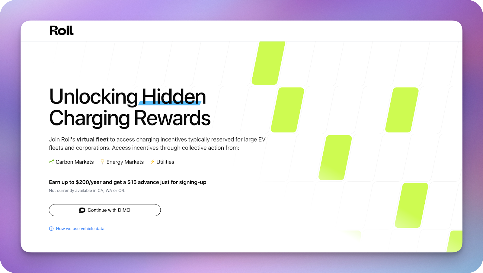 In case you haven’t already heard, DIMO has partnered up with Roil (“Replace Oil”) to allow Tesla drivers in 47 states earn additional yearly rewards just by connecting their vehicles. This works by tapping into carbon offset markets, allowing drivers who charge their Teslas at home to earn up to $200 a year. Roil uses the Login with DIMO SDK to enable vehicle sharing, which also includes the ability to set “compatible vehicles” via the vehicleMakes parameter. This means that as a developer, you have the option to include only certain vehicle makes (in this case, Tesla) based on your use case. Within a matter of weeks, the app gathered vehicle permissions from nearly 4,000 Teslas, including a fleet of over 1,000 vehicles.