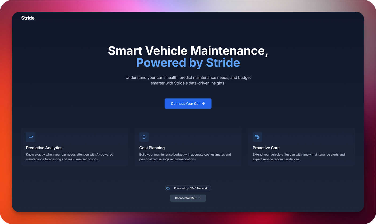One of the first integrations built by a (formerly) non-developer Scott Silver, Stride is currently building a smart vehicle maintenance application, giving users powerful insights to their car’s health. Within the dashboard, you’ll be able to visualize the status of your engine, oil, battery, brakes, and more. Additionally, you can choose to keep track of your vehicle service records directly from the Stride application, and see when it’s time to bring your car back into the shop. Stride has proven that even if you’re not an advanced developer, the Login with DIMO component and Data SDK make it super simple for just about anyone to get up and running quickly.