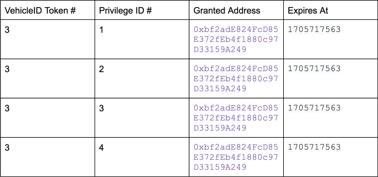 As an example, in the future there could be a special privilege to manage renting out the vehicle that you could grant to a rental contract or another application’s address. We’re excited to see someone build a car rental smart contract at some point!
